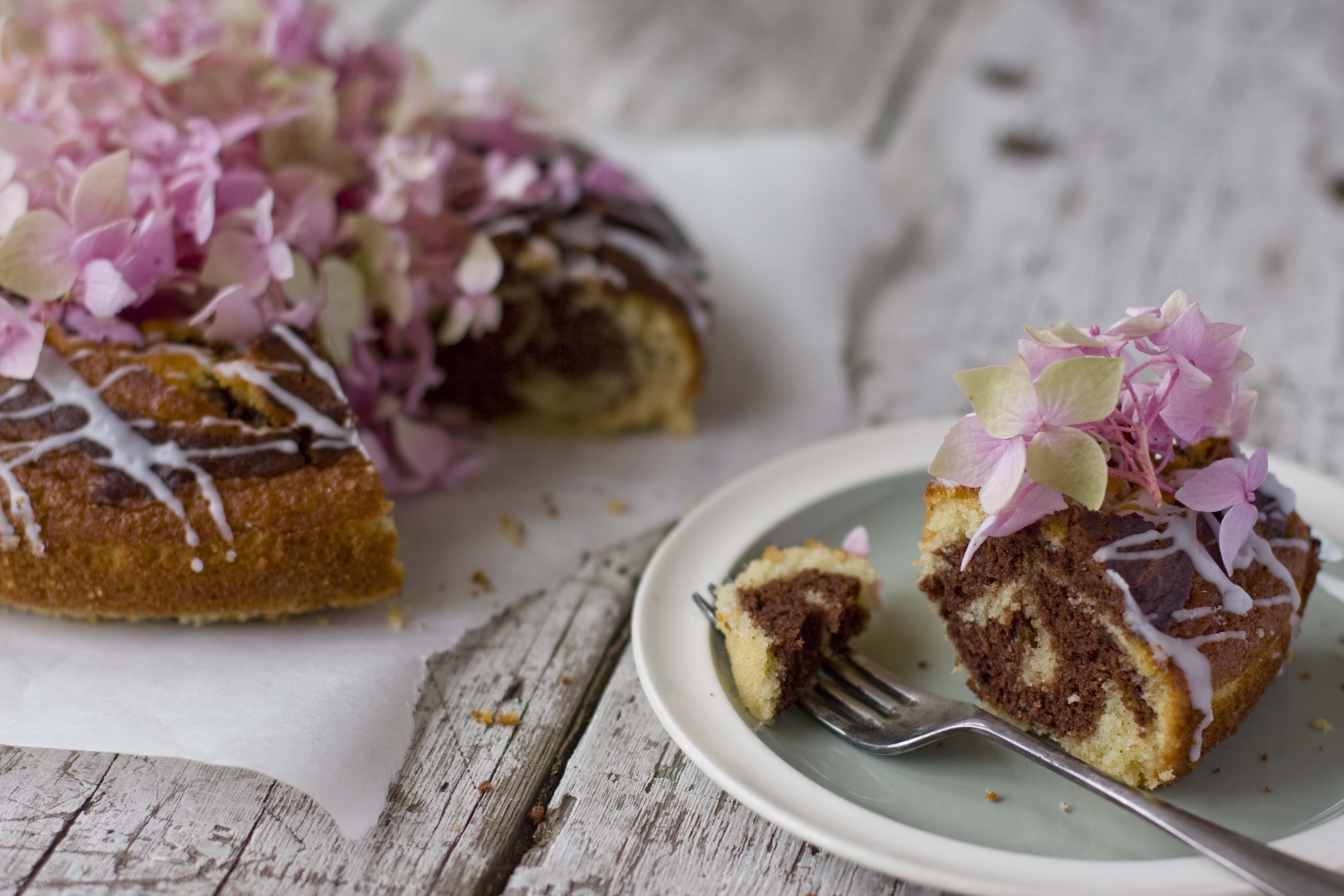 If you need to make a cake that is easy and fairly fast, but looks impressive this Easy Marble Cake recipe is a good choice. As the actual cake is possibly on the simple side, I like to spruce it up with lots of decorations, this time its gorgeous hydrangea.