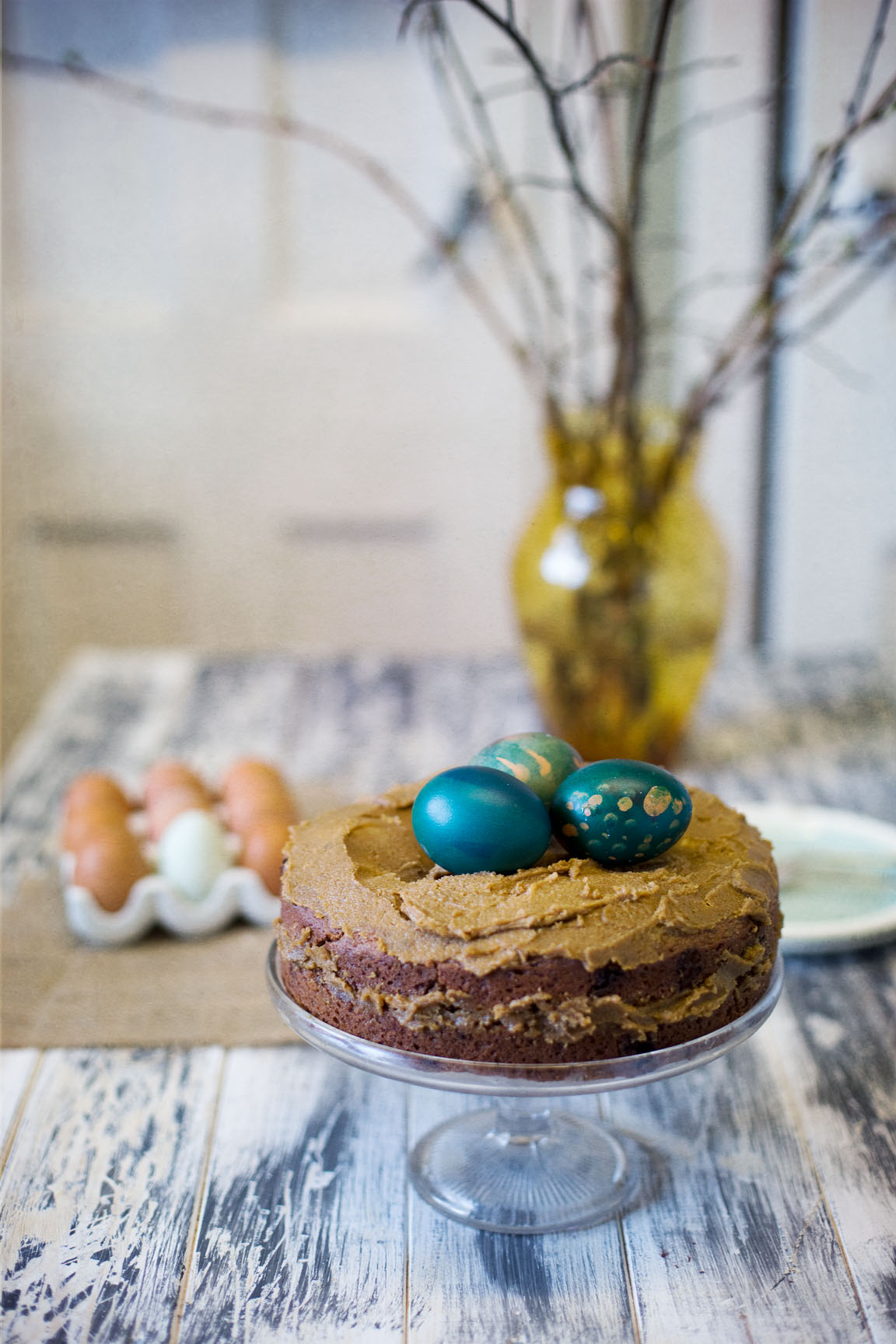 Never the less, I am in ‘ the Easter mood’ and have decorated eggs, gathered spring branches and made Easter dishes, like my Champagne Truffle Easter Cake. Its a simple sponge recipe that I have adapted to be a little more special with the addition of chocolate truffles with champagne. The cake is frosted with a delicious brown sugar butter cream, that tastes of caramel and decorated with ‘hand blown’ dyed eggs.