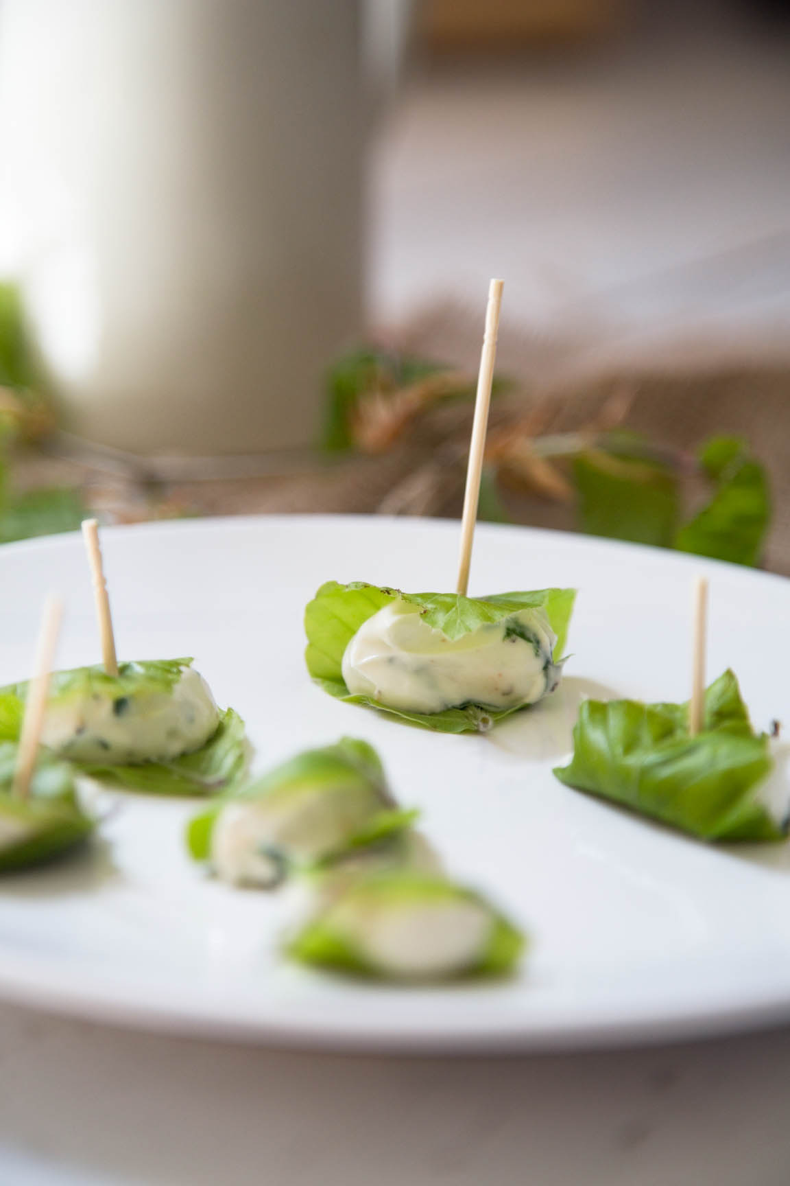 Finly chop the garlic leaves, and mix them with the cream cheese. Add the spices, salt and pepper and place a tsp of the filling onto each of the beech leaves. Gently fold the leaves in half and secure with a cocktail stick. Place in the fridge for an hour before serving them.