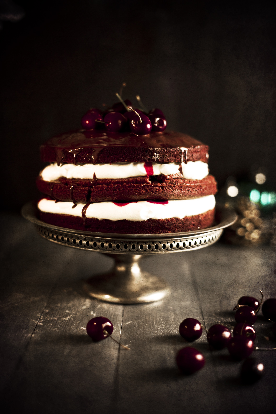 When the cakes are cool whisk the remaining cream until whipped. Spread the cream over two of the cakes, then spoon over the jammy cherries. Stack the cakes together. Spread the chocolate ganache over the top tier, and decorate with extra fresh cherries.