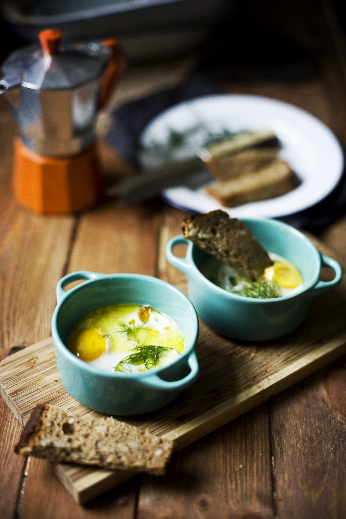 - Break an egg into each ramekin, then pour a tbsp of cream over each egg and add a sprig of dill, salt and pepper.