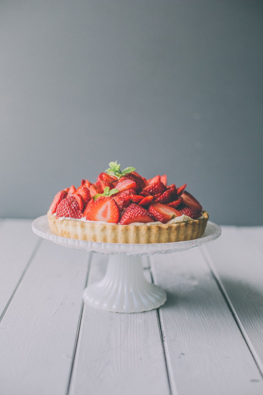 Strawberry Tart – Jordbærtærte. When I think of Denmark I think of red things – the flag, the Christmas Nisse and of course Strawberries! Groundberries as they are known as in Danish are synonymous with summer in Denmark. They are a treasured fruit, savoured by all and made into many delicious dishes. But none come as close to perfection than the majestic Jorbærtærte, ie a Strawberry Tart. It is perfect in every way. It is fruity, sweet, tart, chocolatey, creamy, light and crisp. The only drawback is it does need to be eaten the same day as cooking….What a shame! Despite not being in Denmark, but rather Scotland, and despite not having as good a summer here than in Scandinavia, I did have a fantastic crop of strawberries this year. The birds and the mice also took a fancy to my red berries, but I still got a few kg for myself. And what better dish to serve my homegrown fruit in, than this summer desert. If you don’t have strawberries growing in your garden, (do it …