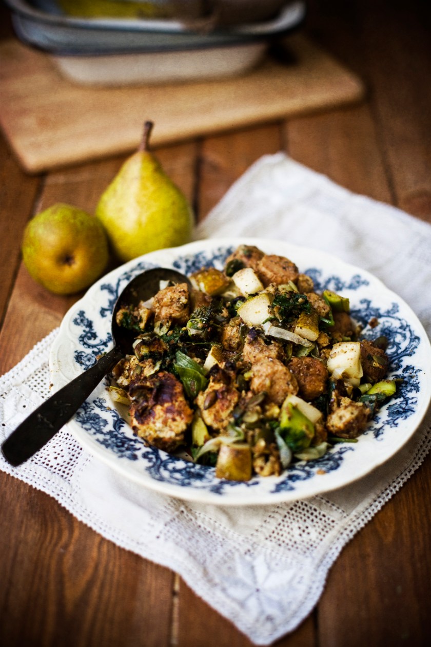 So we have started the new year, and the festive season is over. We can all breathe easy again! I made it through the holidays in good health, and just as new year passed, I got a big old nasty cold! I think the whole country has a cold this week. So, I thought I’d share with you a recipe that I did for Kitchen Garden Magazine this month, on juicy pears. And this stuffing is perfect for enjoying under the covers on the couch, watching daytime TV, and generally feeling sorry for yourself….! When its cold outside, and you’re stuck indoors, comforting food is the way forward, especially when you have a cold! With sweet pear, and tangy leeks, it’s a delicious winter warming dish to try out. I use veggie sausages, but if you eat meat, try using free-range pork sausages. Serve as a side dish, or as a main. _____________________________________________ Pear, Leek and Veggie Sausage Stuffing Serves 4 4 free range pork sausages, or 4 vegetarian sausages, chopped 2 slices of …