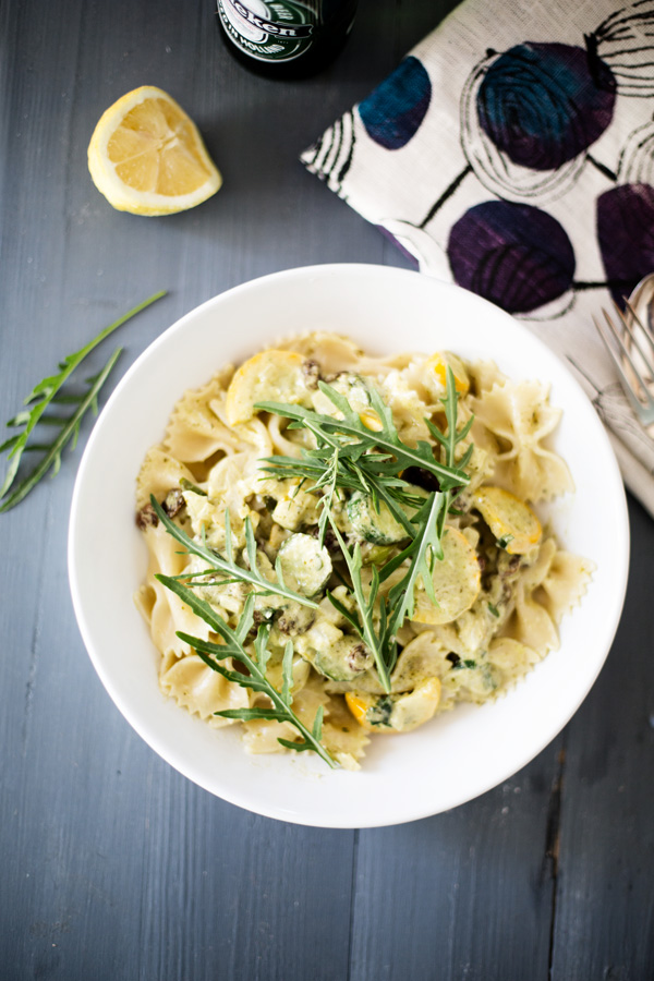 If I’m not entirely mistaken, putting raisins in pasta (or Pizza) dishes is a Sicilian thing. And I’m glad I discovered it. Its not that I’ve got a sweet tooth, I just love food that has a sweet/savory combo going on. And this dish definitely does. I pulled this dish together the other day, as my yellow ‘crook neck’ squash’s are producing lots of small tasty fruits, and they taste best lightly cooked, and al dente. I also have a fantastic amount of peppery rocket needing eaten. And so often when I’m gardening, recipes make themselves out of what fruit and veg is ripe just that very day. This pasta dish is fresh and light, perfect for the middle of summer, but filling and satisfying all at the same time. This is definitely a dish to enjoy outdoors on the terrace on a hot day – dreaming yourself away to Sicily…. ________________________________________________ Serves 4 500g farfalle pasta 1 medium yellow squash 1 small courgette 1 garlic clove a handful golden sultanas a small handful …