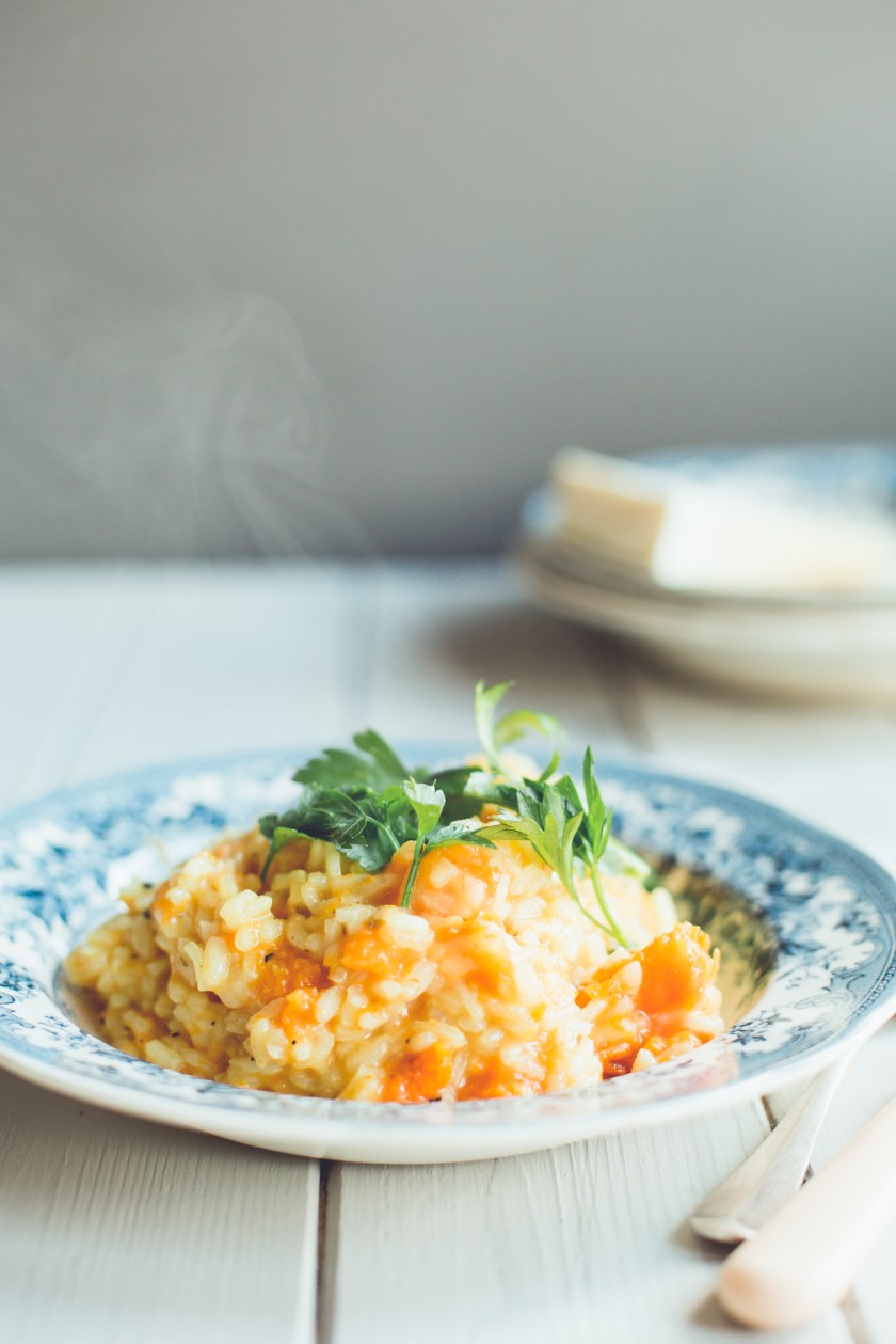 Roasted Butternut Squash Risotto. Butternut Squash is one of my favourite vegetables (but hey, I love pretty much all veggies!) So if you have ever wondered what to do with a butternut squash or winter squash, then I have just the recipe for you – Roasted Butternut Squash Risotto = yum! Roasting your butternut squash first, might seem like an extra step in the cooking process, but it actually makes it easier! How? Well you don’t need to battle with the tough outer skin of the squash, as you roast it skin n’ all! Then all there is to do is scoop out the flesh and add it to the risotto. Roasting the squash until tender also brings out the sweetness, and really enhances the flavour of this Italian inspired dish. I have been lucky enough to have travelled around Italy 3 times, although I was more obsessed with vegetarian ravioli, stuffed with sage butter …drool.. than risotto at the time. Italian food, as you can imagine has a very special place in my kitchen, …